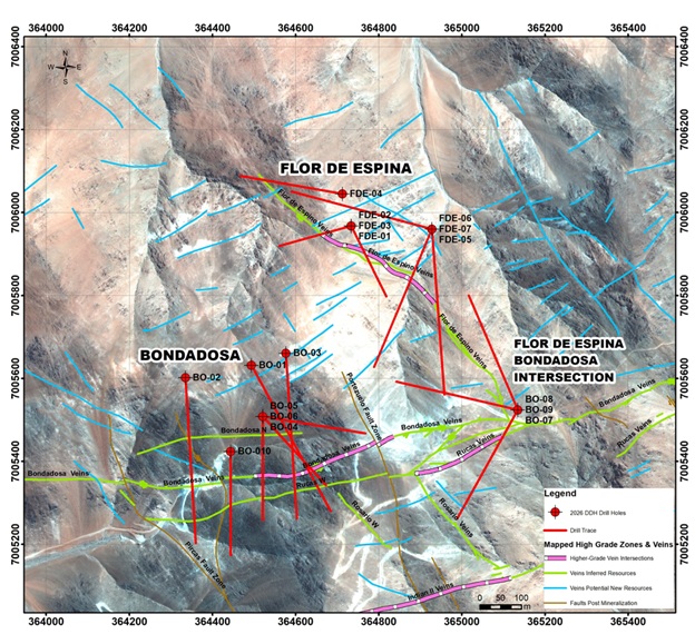 Test down-dip extensions of the Bondadosa and Flor de Espino gold veins and the potential for higher grade and wider zones of mineralization at the intersection of the two veins.