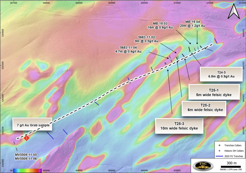 Based on findings from a successful 2025 field season, where systematic exploration that integrated previously airborne geophysics with surface geochemistry and overburden stripping and prospecting was conducted to evaluate known mineralized trends, a 2025 drill program (see Figure 1) was designed. This drill program produced three (3) holes with mineralized intercepts. Two of these holes, including MB25-02, intersected an altered structural zone, while a third intercepted mineralized quartz vein. MB25-02 returned assays of 1.12 g/t over 4.85 m (core length, as there is insufficient data to interpret true width at this point). The confirmation of mineralized intercepts validated exploration strategy. It clearly indicates upside potential in the upcoming drill program, expected to be launched in Spring of 2026.
