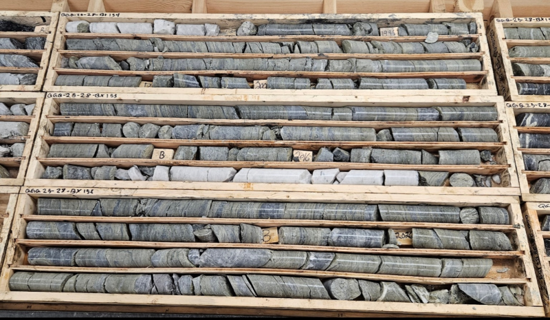 In addition to the placer claim acquisition, Golden Cariboo Resources wishes to provide an update on active drilling. Drill hole QGQ25-28 is ongoing, currently at a depth of 715.00m (2345.80 ft). It has intersected intermittent quartz-carbonate veining, silicification and disseminated and stringer pyrite mineralization as seen in the picture below. This drilling is targeting northwest of the Halo zone.