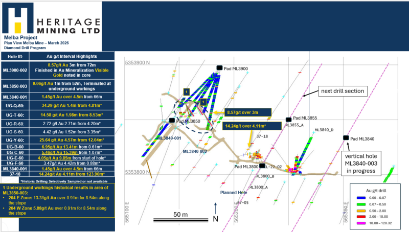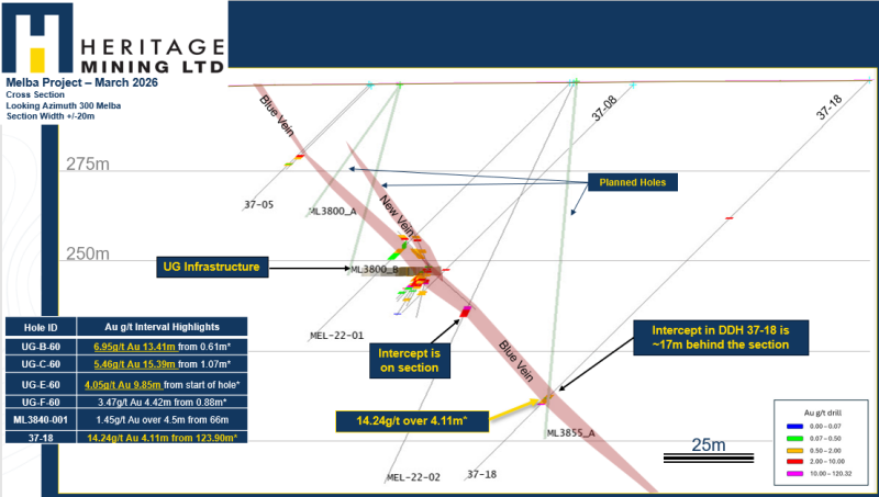 Heritage Restarts Drilling Targeting Historical High-Grade at Depths: Up to 14.24g/t Au over 4.11m from ~85m from surface at Melba