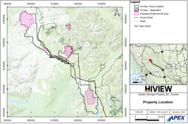 VANCOUVER, BRITISH COLUMBIA – TheNewswire – MARCH 24, 2026 – HI-VIEW RESOURCES INC. (“Hi-View” or the “Company”) (CSE: GXLD; OTCQB: HVWRF; FSE: B63) announces the successful amendment to Mine No. 0200018 (Permit No. MX-100000327) for its Golden Stranger Property. The amendment now incorporates the Lawyers East, Saunders, and Borealis porphyry target zones, significantly enhancing the value of the Company’s Toodoggone Portfolio and establishing a carefully managed five-year exploration framework.