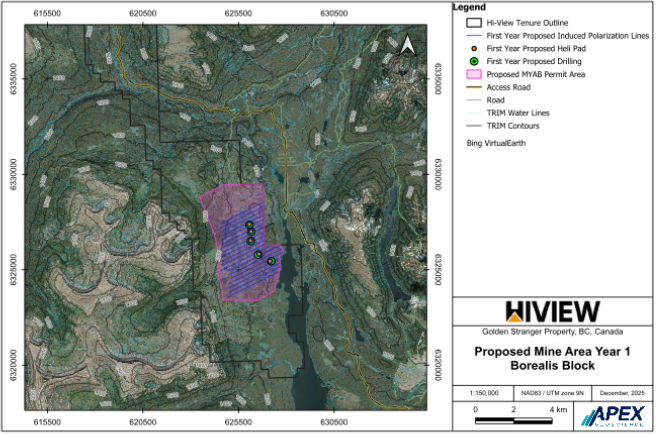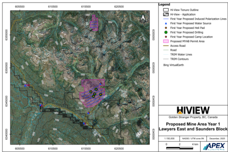 Over the five-year term on this amendment, Hi-View has planned up to 100 line-km of IP surveying and up to 45 drill pads across prioritized targets. The five-year program will mark a strong start, with approximately 73 line-km of IP surveying and up to 26 drill pads proposed, supported by a temporary camp and existing infrastructure. All activities are designed to minimize environmental impact, including the use of previously disturbed areas where possible, small-footprint drill pads, responsible water management, secure fuel storage, and progressive reclamation.