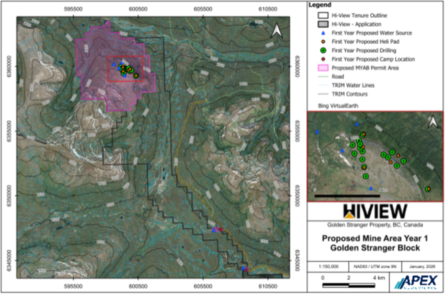 The Golden Stranger Project Area encompasses the same footprint approved under the original permit (Permit No. MX-100000327). For the five-year work plan, the Company is proposing 16 heli-access drill pads supported by 6 helipads within this area. The Golden Stranger MYAB area also permits a temporary camp of up to 12 structures, which may be utilized; however, the Company’s preference is to establish a more centrally located camp along existing road access, where feasible, rather than rely solely on a helicopter-supported fly camp.