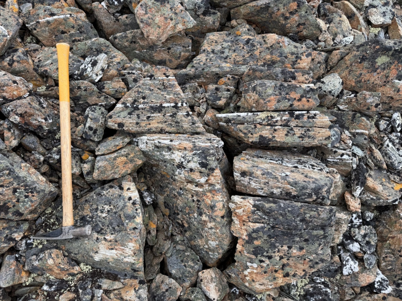 Sheeted quartz veins follow foliation over an area of roughly ~2 km x 300 m and occur at a density of up to 10 veins/m (Figure 2).