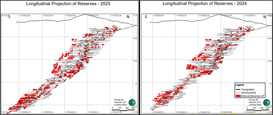 The Longitudinal sections shown in Figure 6 illustrate the spatial distribution of the Mineral Reserves and actual development at the Pilar Mine.