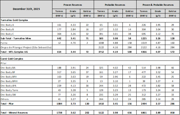 The updated Mineral Reserve estimate for the Pilar Mine now totals 286,000oz, contained in 2,494 thousand tonnes at an average grade of 3.57 g/t Au, representing a net increase of 94,000oz in Proven & Probable Mineral Reserves, compared to the previously reported 192,000oz (1,536kt @ 3.89 g/t Au) of Proven & Probable Mineral Reserves. The NI 43-101 Technical Report on Caete Mineral Complex December 31,2025 is now available on SEDAR+.