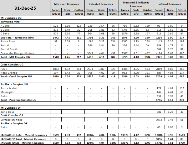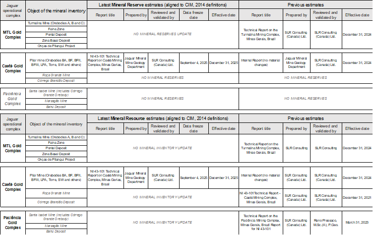During 2025, the Pilar Mine was Jaguar’s sole operating mine, with the Turmalina Mine in the MTL Complex returning to operating status in March 2026 (see Jaguar Mining Press Release dated March 9, 2026). As a result, only the Mineral Resource and Mineral Reserve (MRMR) for the Pilar Mine has been updated, as MTL remained on an embargo-related halt and no additional drilling could be completed throughout 2025. For the Onças de Pitangui (OdP) project, the MRMR figures remain unchanged from those reported in March 2025, despite an infill drilling program that commenced in 2025 and will continue through 2026. For both assets MTL and OdP, the Company plans to update the mineral resources next year.