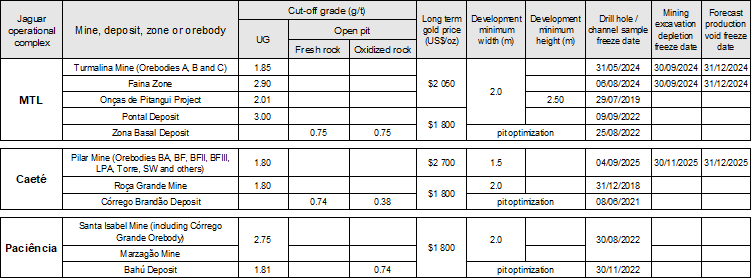 Mineral Reserves are estimated at a cut-off grade of 2.59 g/t Au for orebodies A, B, and C at Turmalina deposit and 2.45 g/t Au for Pilar deposit. For Faina, the Mineral Reserves are estimated at a cut-off grade of 4.06 g/t Au and 2.41 for Onças de Pitangui.