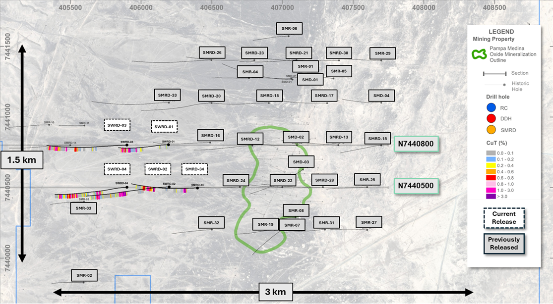 “Pampa Medina continues to demonstrate remarkable consistency of grade and thicknesses across the currently defined area of interest. The Phase II program was predominantly 300m-spaced grid-based drilling intended to define the extent of the mineralized system in which we are yet to define the limits. The 2026 program will focus on definition drilling of the identified high-grade corridors between sections N7,441,100 and N7,440,500, as well as Pampa Medina Norte (SMD/SMR-01) in both oxides and sulphides, as well as continued large-scale step-outs to test regional continuity of the favourable host rocks. Our exploration model is strengthening at Pampa and we look forward to updating the market with our evolving interpretations of the manto-system ahead of the Phase III program in 2026.