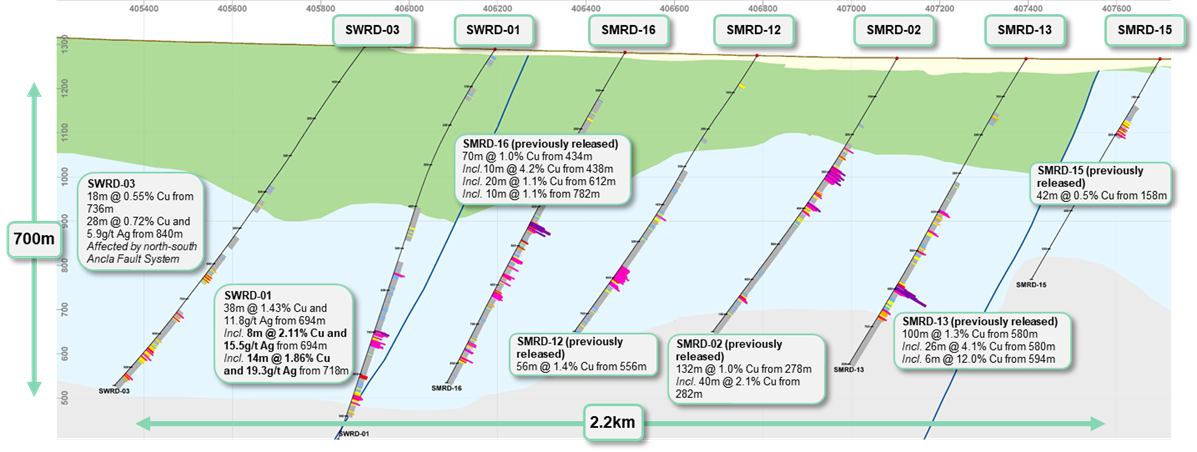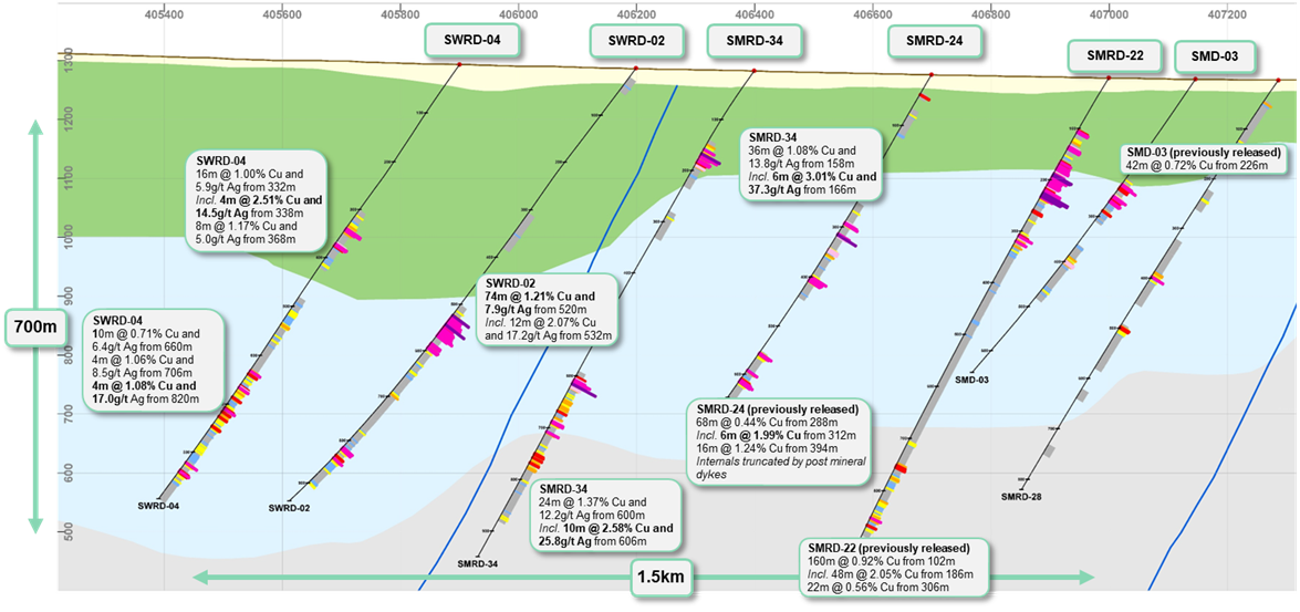 SMRD-34, drilled in between SWRD-02 and SMRD-24 on a 300m spacing, intersected mineralization in both the near-surface upper volcanics and the lower sediments