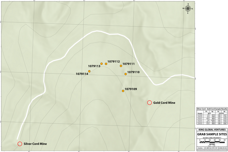 The sampling also identified a 3-inch vein at Upper Gold Cord that returned high-grade silver