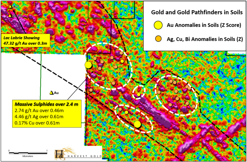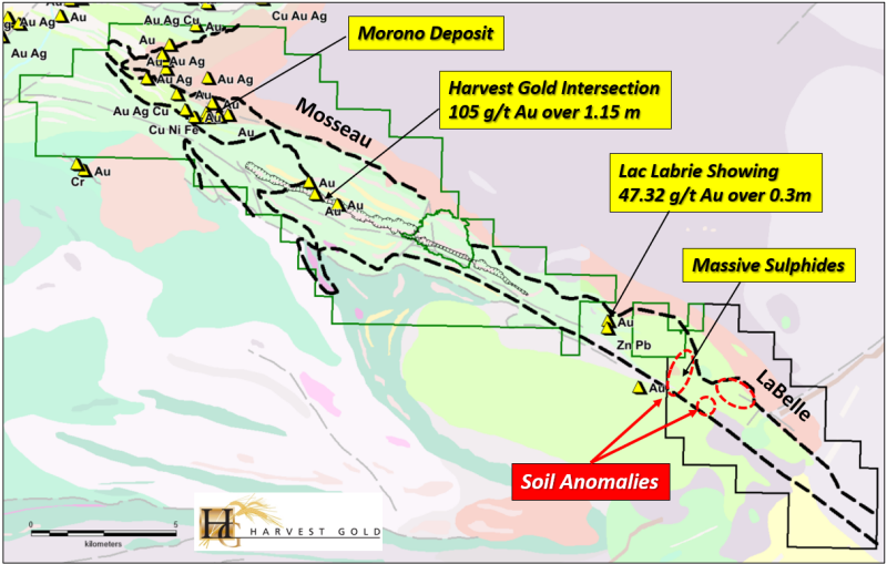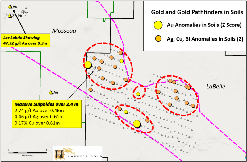 Harvest Gold President and CEO, Rick Mark, states: “These soil geochemistry results provide more evidence as to the broader potential of our now combined properties. The newly identified gold anomalies at LaBelle demonstrate that the mineralizing system extends beyond the known showings and highlights more compelling targets for drilling and follow-up work. We believe these geochemical signatures elevates the significance of our recent land acquisitions as it increases the probability of making and owning additional discoveries along this highly prospective corridor.”