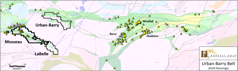 Harvest Gold’s three properties, Mosseau, Urban-Barry and LaBelle, together cover over 50 km of favorable strike along mineralized shear zones.