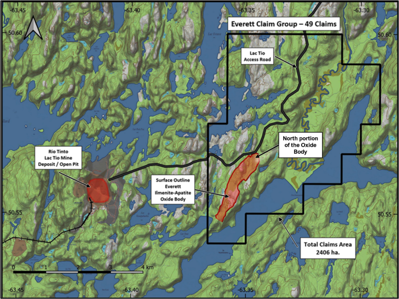 The Everett Property is recognized by the USGS and the Quebec Geological Sciences Service as one of the most significant hard-rock ilmenite (FeTiO3) deposits in the world, alongside producing deposits at Lac Tio, Quebec (Rio Tinto Fer et Titane Inc.) and Tellnes, Norway (Kronos Worldwide Inc.). The Everett Property is situated 3 km east of the world’s largest hard-rock ilmenite deposit, Lac Tio. The deposit at Lac Tio is not necessarily indicative of the grades and tonnes of the adjacent Everett Property. Still, the two deposits share a closely similar mineralogy and are both hosted by mafic intrusions of the Havre-Saint-Pierre anorthosite massif.