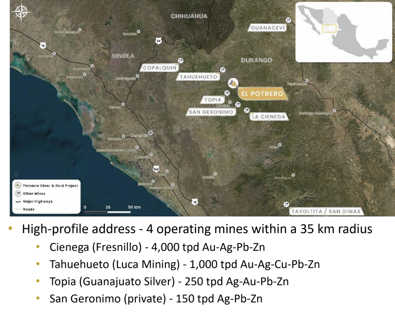 El Potrero is located in the prolific Sierra Madre Occidental of western Mexico and lies within 35 kilometres of four operating mines, including the 4,000 tonnes per day (tpd) Ciénega Mine (Fresnillo), the 1,000 tpd Tahuehueto Mine (Luca Mining) and the 250 tpd Topia Mine (Guanajuato Silver).