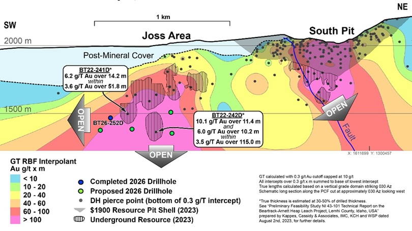 The first phase, open pit heap leach Preliminary Feasibility Study (“PFS”) at Beartrack-Arnett and the resulting Net Asset Value estimate excludes underground Mineral Resources. The current drill program at Joss is planned to evaluate the potential for a subsequent underground phase of operation at Beartrack-Arnett.