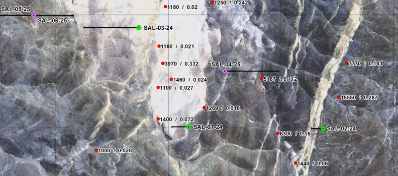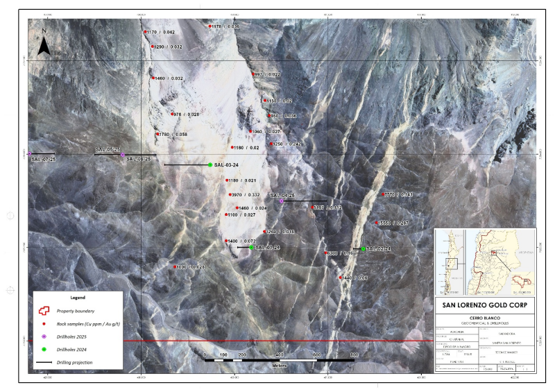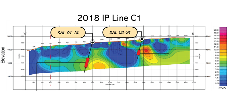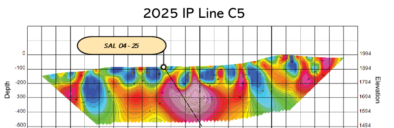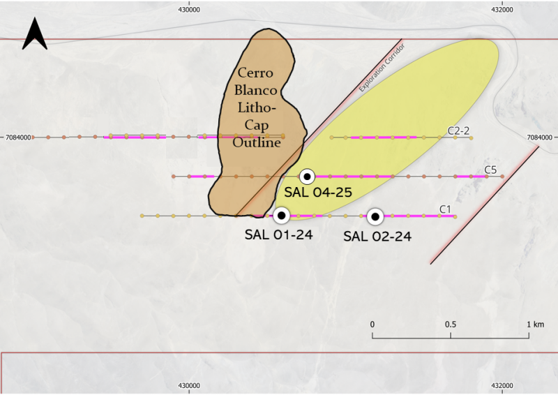 San Lorenzo has drilled 3 holes on the eastern side of the Cerro Blanco litho-cap feature (northernmost circle on Figure 1). Two of those holes were drilled in the 2024-2025 program (holes SAL 01-24 and SAL 02-24). The third hole (SAL 04-25), the first hole in the current program, was drilled on an in-fill IP line obtained during the most recent (summer 2025) IP program. A fourth hole on the east side of the litho-cap feature was planned to test the strongest IP conductivity/resistivity anomaly identified to date, which is located on the eastern end of the northernmost IP line. That hole has not yet been drilled due to terrain limitations. However, it is scheduled to be drilled in the near future. The locations of the 3 holes that have been drilled are illustrated on the figures below which include their related IP lines and their locations relative to those IP lines – the only IP lines run by San Lorenzo to date. Insofar as IP has been proven to be a very useful exploration tool on the Salvadora property, San Lorenzo is actively planning an IP program that will provide additional data both north – and now to the south as well – of the existing IP lines. It is intended that additional drilling will follow IP. Drilling is targeted to: