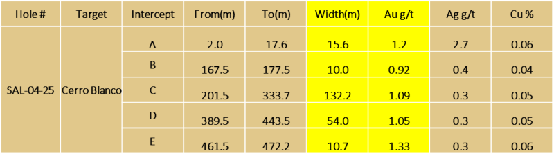 2)Confirm the interpretation that the mineralization is sub-vertical as can be witnessed on the valley floor 1.7 km to the north of hole SAL 04-25.