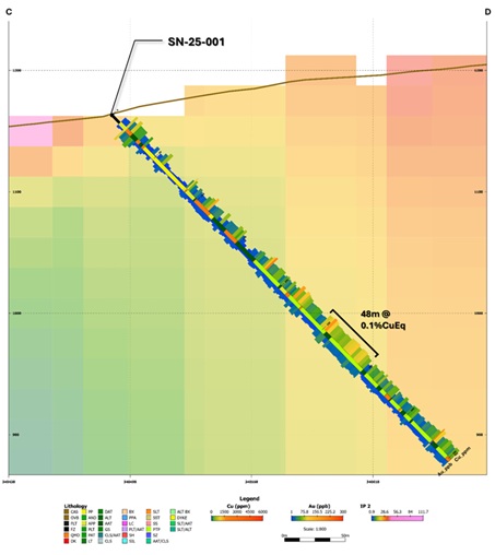 The Copper Creek hole returned the stronger inaugural result and provides direct confirmation that the historical mineralized corridor remains intact. SN-25-001 returned lower overall grades, but it successfully intersected the intrusive-volcanic architecture, patchy potassic overprint, and sulphide-bearing vein systems expected in a fertile porphyry environment. The Company believes the two holes together materially improve targeting confidence for 2026 follow-up drilling at both satellite areas.