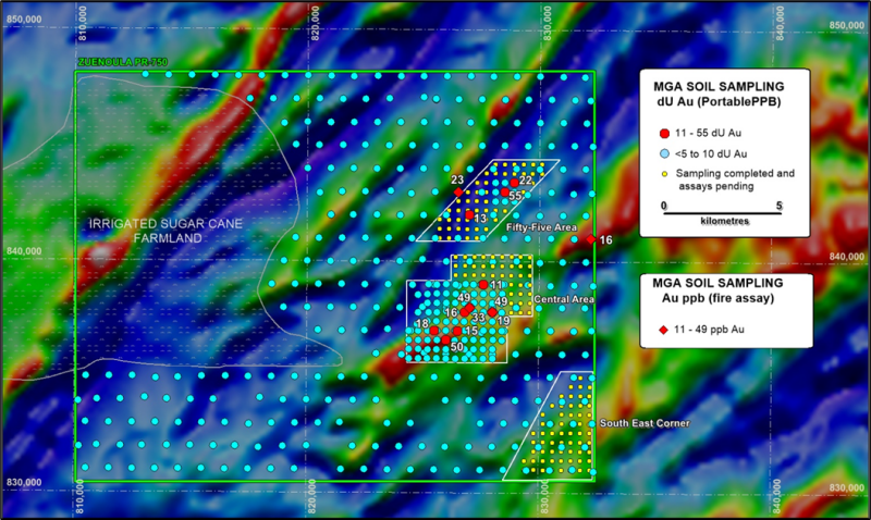 Infill sampling of the initial 13km2 Central Area has been completed on a 400 m × 400 m grid and PortablePPB assays received (Figure 1). These results further increase the strike-length of the Central Area gold anomalous cluster (trend) to 3.4km. The Central Area has now been expanded to 20km2 to cover the NE-strike of this potential gold anomalous trend. Sampling has been completed and assay results are pending.