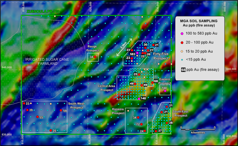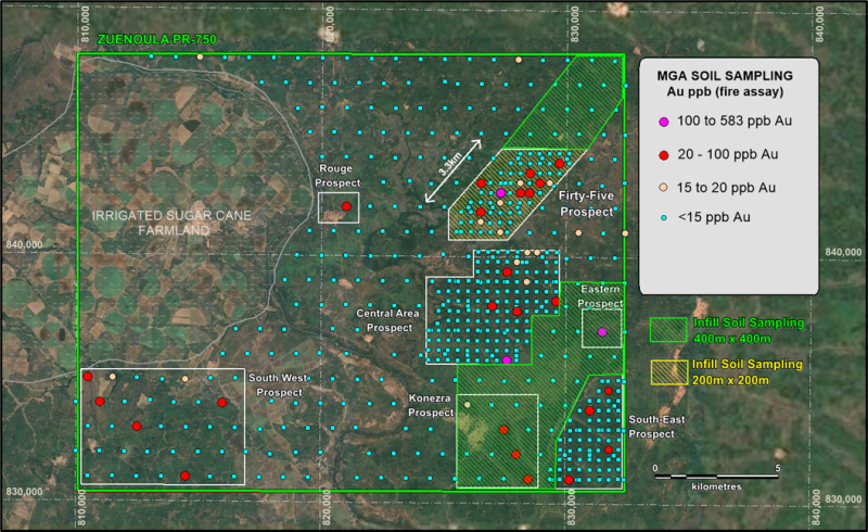 These seven gold prospects include the previously reported Fifty-Five, Central and South-East Prospects, together with newly identified Eastern, Rouge, Konezra and South-West Prospects, all characterised by one or more +30 ppb Au soil anomalies derived from systematic geochemical soil sampling.