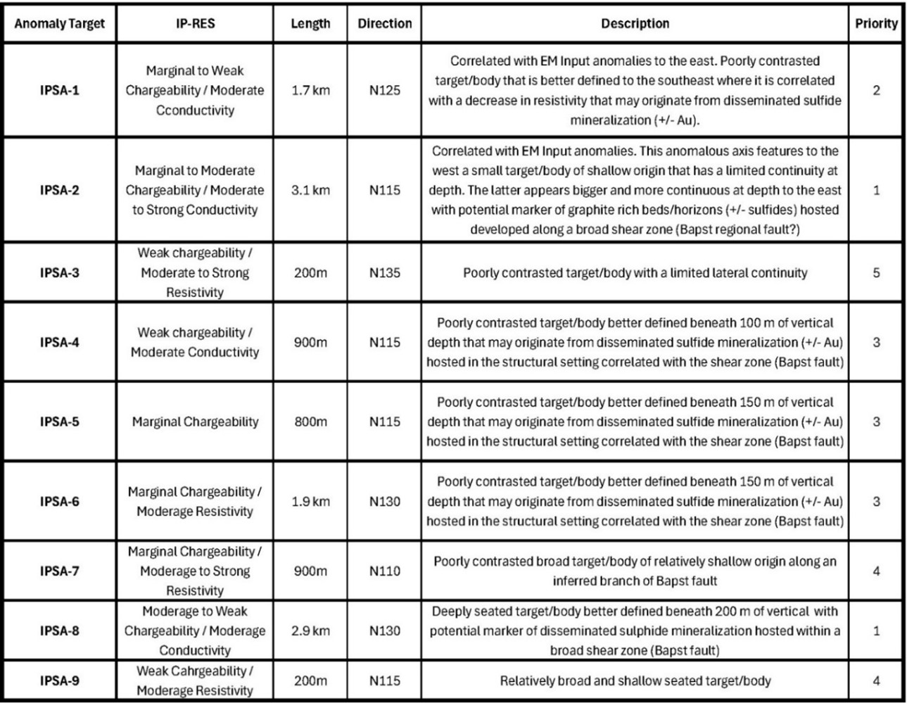Primary targets for advanced exploration (IPSA-2, IPSA-8) are high-priority, structurally controlled anomalies, directly associated with the Bapst fault. Secondary targets (IPSA-1, 4, 5, 6) are located in the zinc zone and southeastern area, representing subordinate, lower-contrast induced polarization (IP) anomalies requiring follow-up. (Fig. 2).