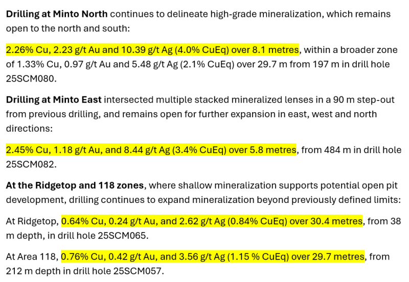“These results are being incorporated into ongoing resource modelling and study work as we advance the Preliminary Economic Assessment (PEA) for the Minto copper-gold-silver mine, which is on schedule to be completed by mid-2026,” added Joudrie.