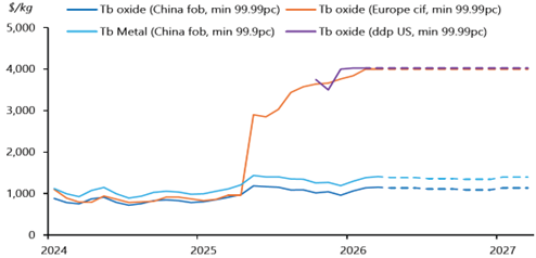 Figure 3: Dy and Tb oxide prices in China (FOB) compared to Europe (CIF), spot and forecast (Source: Argus Media, 2026)