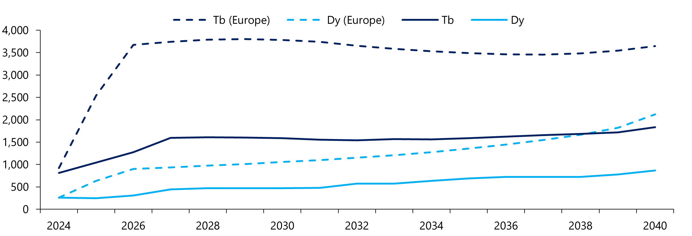 Argus Media has assessed European prices for Nd and Ce oxides and metals since 2012 and Dy, Tb, and Er oxides since 2015. In July 2025, it introduced prices for Pr and NdPr oxides to complete the suite of REE PM materials. Historically, European prices have tracked Chinese FOB prices (with the addition of shipping to reflect the CIF [8] Rotterdam assessment) because most of the material traded in Europe would be of Chinese origin. In the future, it is likely that European prices will decouple from Chinese prices as the supply chains not reliant on China are created and are based on the costs curve for non-Chinese production of REEs. Figure 3 demonstrates the comparison between Chinese FOB prices and European CIF prices for Dy and Tb.