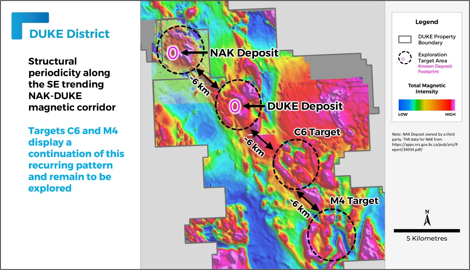 Notably, the large DUKE Cu-Mo-Au-Ag Deposit lies approximately 6 km to the southeast of American Eagle’s promising NAK Cu-Au Deposit (see American Eagle website https://americaneaglegold.ca). Figure 1 illustrates a structural periodicity along the southeast trending regional NAK-DUKE magnetic corridor. The NAK and DUKE Deposits, outlined in red, are situated within evenly-spaced, recurring clusters of magnetic anomalies. The DUKE JV’s targets C6 and M4 display a continuation of this recurring pattern to the southeast of the DUKE Deposit, showing magnetic anomalies clustering at repeated 6 km spacings. These exploration targets are interpreted to reflect zones of fault intersections with regional southeast trending structures, representing mineralizing fluid pathways analogous to those responsible for most deposits in the Babine Region. Future exploration by the DUKE JV will focus on identifying prospective chargeability and geochemical anomalies across these target regions to firm-up drill targets.