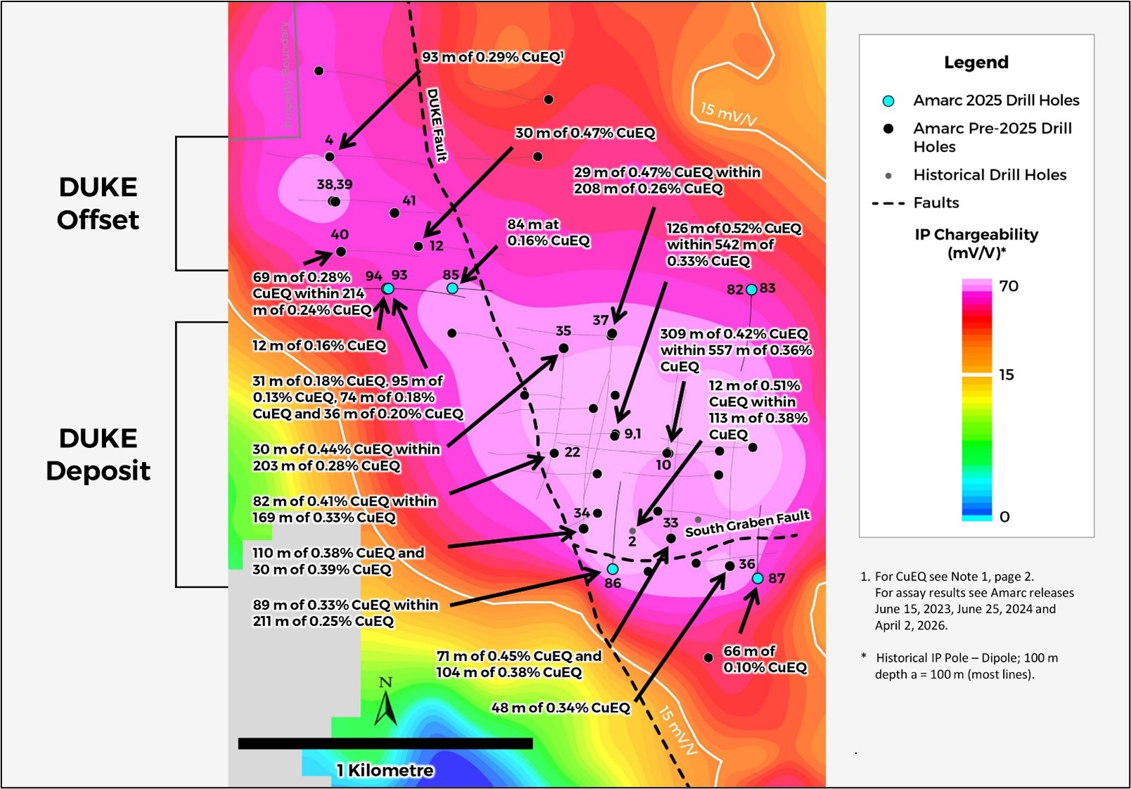 Additionally in 2025, three holes were drilled along a 440 m long east-west fence across the southern end of DUKE Offset (120 m to 150 m south of previous drilling, Figure 2 and Table 1), extending this deposit-area. Previous drilling by Amarc within the DUKE Offset encountered important Cu-Mo mineralization outlining a newly recognized volume of mineralized rock west of the DUKE Fault. This represents a portion of the DUKE Deposit of unknown extent that was displaced some 450 to 500 m northwards (see Amarc release June 25, 2024). Hole DK25085 returned 84 m at 0.16% CuEQ (0.10% Cu, 0.01% Mo, 0.02 g/t Au, 1.0 g/t Ag) from 105 m, hole DK25094 returned 12 m of 0.16% CuEQ (0.09% Cu, 0.02% Mo, 0.01 g/t Au, 0.5 g/t Ag) from 54 m, and hole DK25093 returned 31 m of 0.18% CuEQ (0.13% Cu, 0.01% Mo, 0.02 g/t Au, 0.6 g/t Ag) from 31 m, 95 m of 0.13% CuEQ (0.10% Cu, 0.02 g/t Au, 0.5 g/t Ag) from 101 m, 74 m of 0.18% CuEQ (0.11 Cu, 0.01% Mo, 0.09 g/t Au, 0.9 g/t Ag) from 219 m and 36 m of 0.20% CuEQ (0.15% Cu, 0.05 g/t Au, 1.4 g/t Ag) from 314 m. The DUKE Offset area now extends over greater than 400 m north-south, 450 m east-west and 250 m in depth.