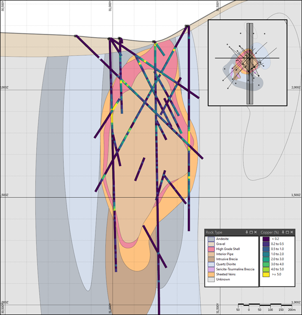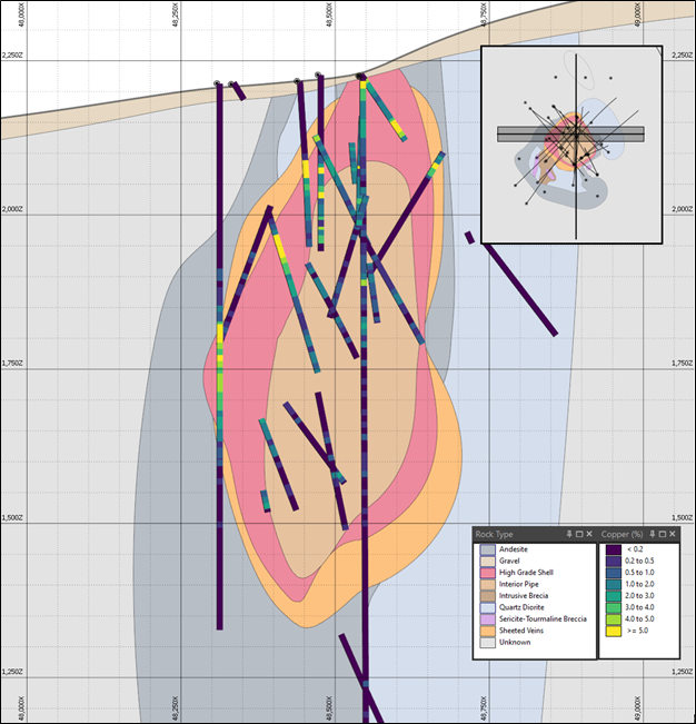 APEX personnel modeled all lithological units identified in the historical plan maps and sections and interpreted several mineralization domains (Figures 1 and 2). Based on the historical data reviewed, the highest-grade copper (“Cu“) domain is interpreted as a high-grade shell (the “High-Grade Shell“) located outside the interior pipe (the “Interior Pipe“), with an average grade of approximately 2.4% Cu. Surrounding that shell, APEX interpreted and modeled a sheeted vein (the “Sheeted Vein Zone“) domain with average grades of approximately 0.9% Cu. The Interior Pipe domain averages 0.60% Cu. APEX personnel also modeled two breccia types-intrusive breccia and sericite-tourmaline breccia-which returned similar average copper grades of approximately 0.3% Cu and may be grouped as a single breccia-style domain for future work. At a broader scale, andesite and quartz biotite form a lower-grade mineralized envelope averaging approximately 0.15% Cu and may likewise be grouped as a single low-grade domain. Additional low-grade mineralized shells were interpreted on the north side of the deposit, but APEX noted that these areas will require additional logging data, including relogging of historical core, and additional drilling to confirm continuity. The grades of these domains are based on length-weighted average %Cu and do not take into account gold or silver by-products at this stage of analysis.
