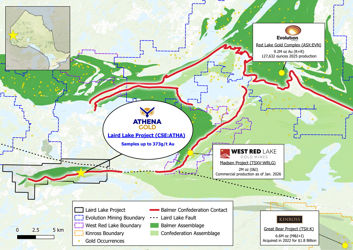 Figure 1: Map of Red Lake Gold District, showing Athena’s Laird Lake project and nearby deposits. Mineralization on nearby or adjacent projects is not necessarily indicative of mineralization at Laird Lake.