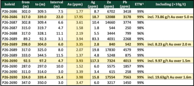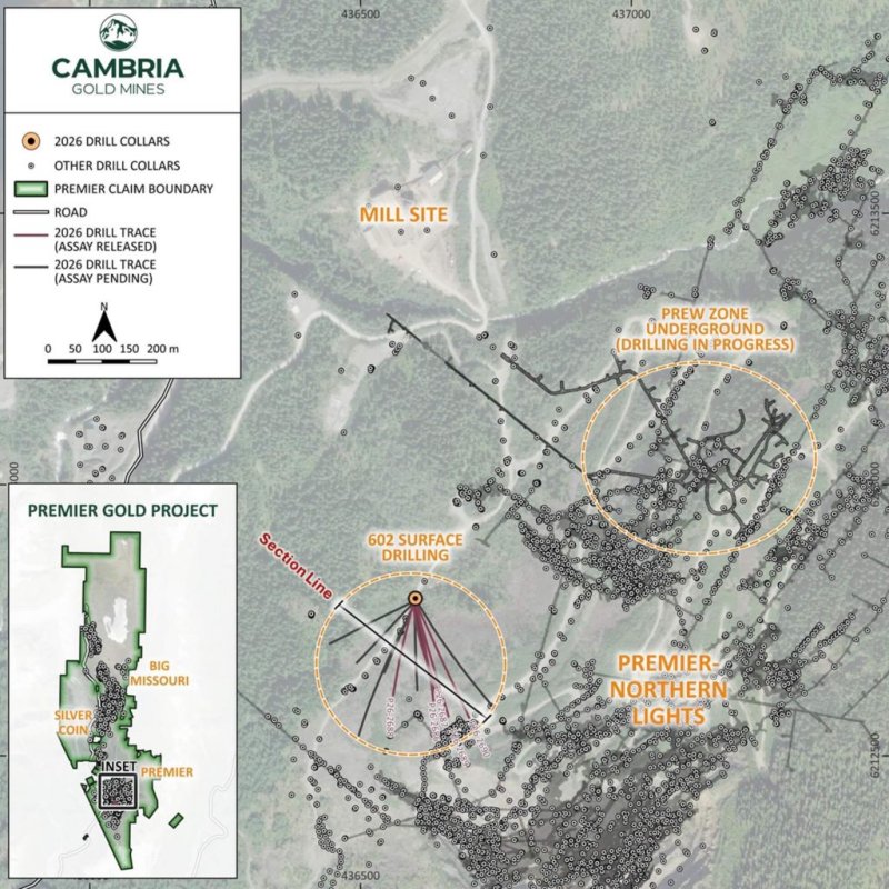 Vancouver, BC – TheNewswire – April 27, 2026 – Global Stocks News – Sponsored content disseminated on behalf of Cambria Gold Mines. On April 21, 2026, Cambria Gold Mines (TSXV: CAMB; OTCID: AOTVF) announced the first results from its ongoing infill drilling at the Premier Gold Project (PGP), located in northwestern British Columbia. Highlight intercept: 22 meters @ 17.95 grams per tonne (g/t) gold, including 552.0 g/t gold over 0.5 meters.