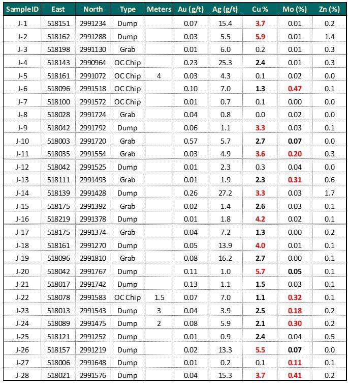 In a press release dated December 2, 2019 – Valterra Resource Corporation reported results of the surface sampling collected from waste dumps and some limited outcrop chip samples at Los Reyes. The average Cu grade was 3.1% and 22 of 28 samples had values >1% Cu. The more anomalous samples also contained elevated precious and base metal values, reaching up to 0.57g/t Au, 25.3g/t Ag, 0.47% Mo and 1.7% Zn (see Table 1).
