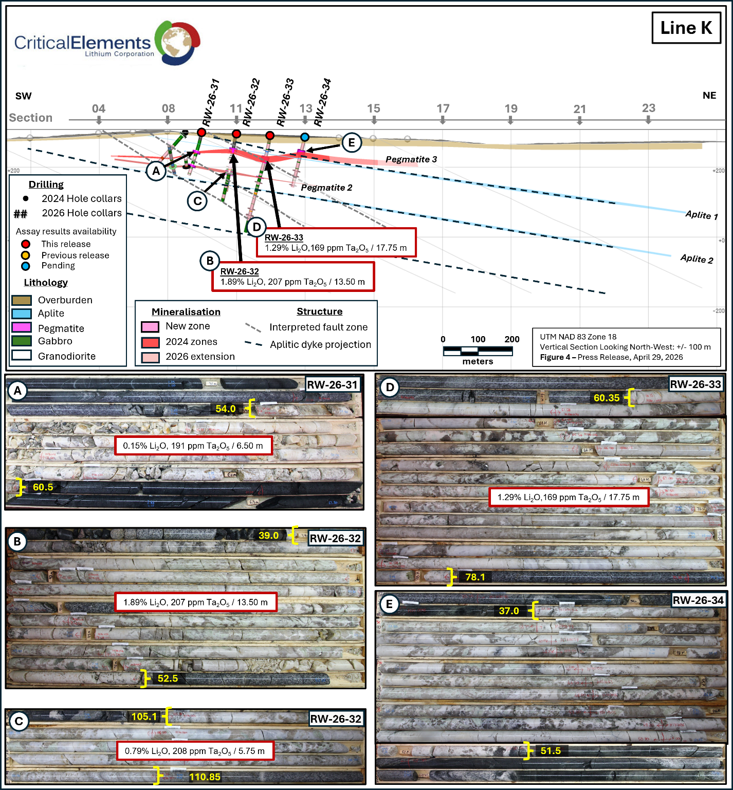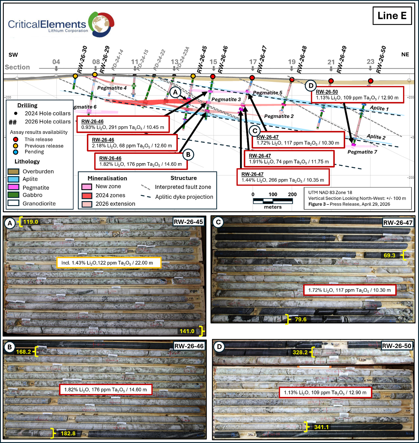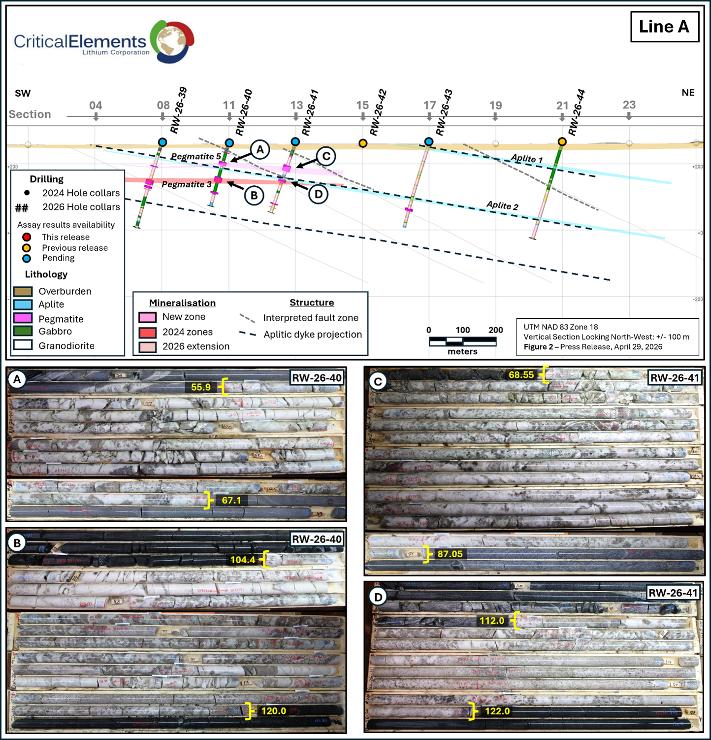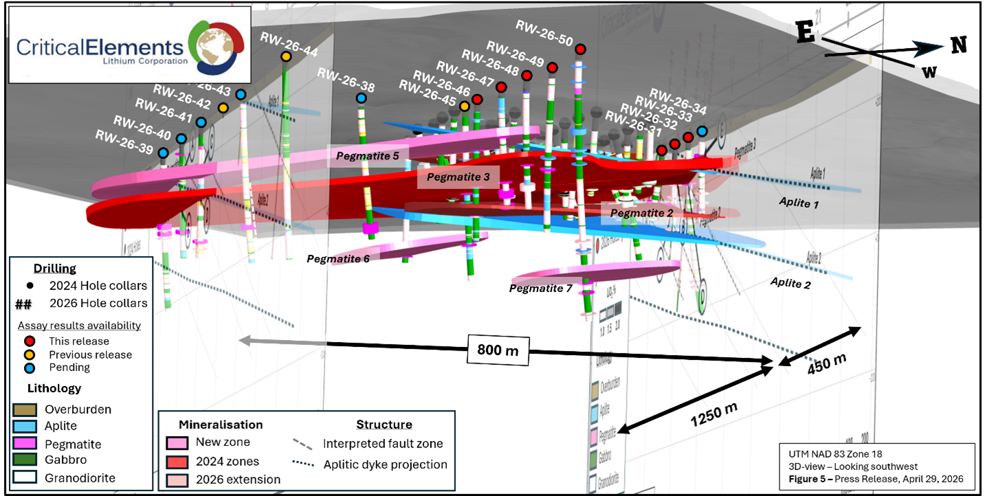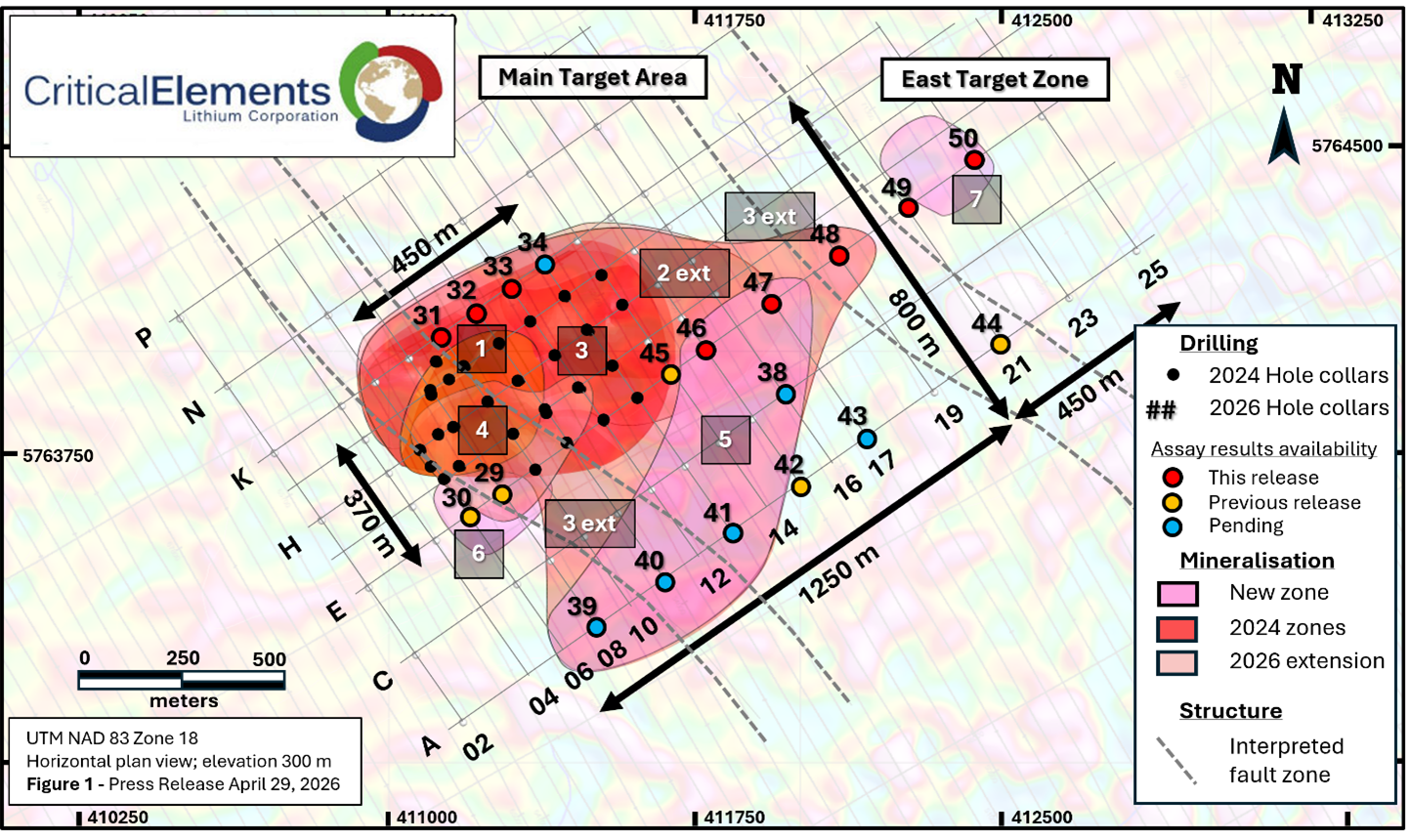 MONTRÉAL, QC / ACCESS Newswire / April 29, 2026 / Critical Elements Lithium Corporation (TSXV:CRE)(US OTCQX:CRECF)(FSE:F12) (“Critical Elements” or the “Corporation”) is pleased to provide assay results and an update on its Phase 1 Winter 2026 drill program, at the 100% owned Rose West Discovery (“Rose West“), located in Eeyou Istchee, Québec.