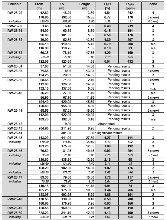 1.72% Li2O and 117 ppm Ta2O5 over 10.30 m (including 2.61% Li2O and 117 ppm Ta2O5 over 6.35 m), through Pegmatite 5 (new), in hole RW-26-47