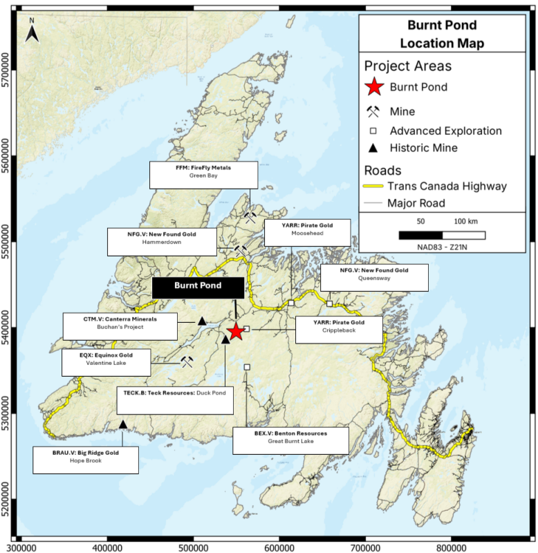 The Burnt Pond Project is located in Central Newfoundland, approximately 30 km southwest of Grand Falls-Windsor and 16 km southeast of Millertown. The Burnt Pond Project is road accessible and lies approximately 10 km northeast and along trend from the past-producing Duck Pond Mine, within the Tally Pond volcanic belt of the Victoria Lake Supergroup. The belt has been explored for more than 40 years, with extensive historical work by Noranda beginning in 1973, which led to the discovery of the Burnt Pond prospect and later the Boundary and Duck Pond deposits (Reid, W. and Heerema, D., 2016).