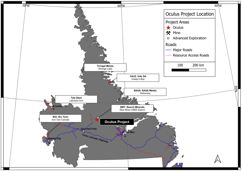 The Oculus Rare Earth Project is located in the Central labrador Critical Rare Earth Element District. The Oculus Project covers approximately 2,550 hectares, situated approximately 110km northeast of Churchill Falls and approximately 20km east of the Orma Lake hydro access road, an all-weather route that connects to the Trans-Labrador Highway.