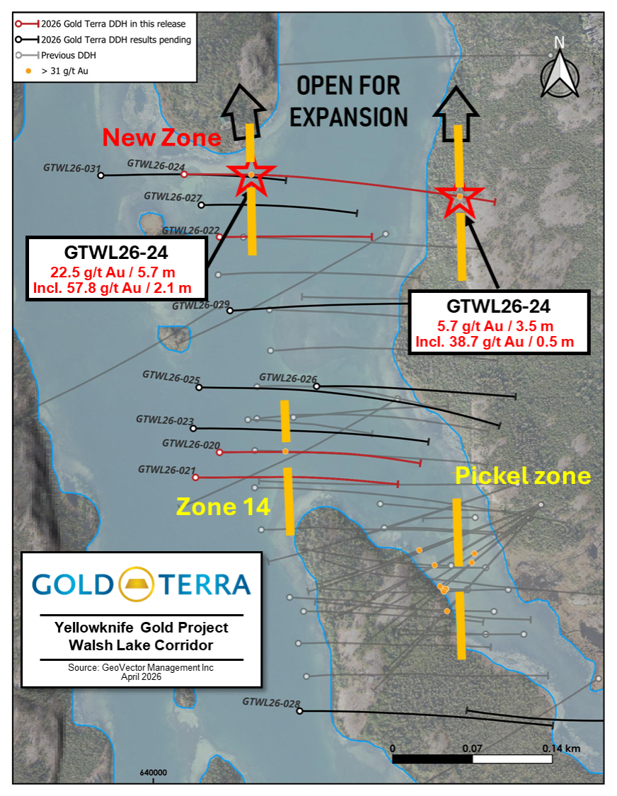 VANCOUVER, BC / ACCESS Newswire / April 8, 2026 / Gold Terra Resource Corp. (TSX-V:YGT)(Frankfurt:TX0)(OTCQB:YGTFF) (“Gold Terra” or the “Company“) is pleased to announce assay results from the first four (4) holes of the 2026 Winter Drill Program designed to expand the Walsh Lake gold corridor situated in the Northbelt area of Gold Terra’s 100% owned district scale Yellowknife Project. Assay results are shown in Table 1 and include drill hole GTWL26-024 which intersected 22.46 g/t Au (uncut) over 5.7metres from 119.6 metres to 125.3 metres downhole, including 198 g/t over 0.5 metres starting at 119.60 metres.