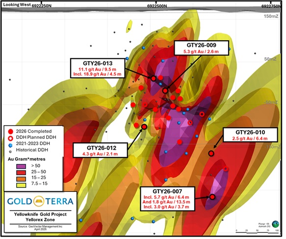 VANCOUVER, BC / ACCESS Newswire / April 14, 2026 / Gold Terra Resource Corp. (TSXV:YGT)(Frankfurt:TX0)(OTCQB:YGTFF) (“Gold Terra” or the “Company“) is pleased to announce assay results from an additional five (5) holes of the 2026 Winter Drill Program targeting the Yellorex zone immediately south of the past producing Campbell Shear (CS), historic Con Mine (1938-2003). The current drilling program aims at confirming some historical holes and to potentially expand Gold Terra’s near surface 2022 Mineral Resource Estimate (MRE) on the Con Mine Option property.