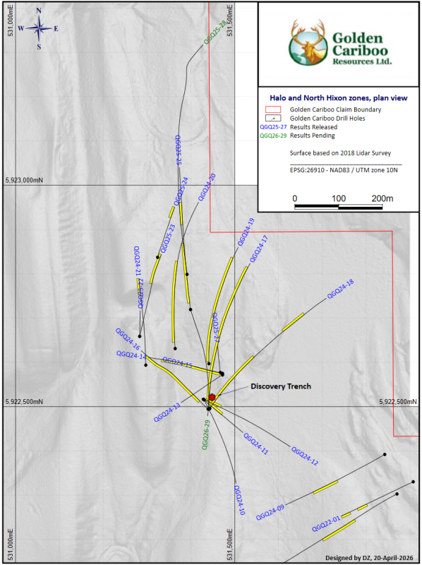 Drill hole QGQ26-29 was collared at the same drill pad as QGQ24-25 and was aligned to 170°/-72° dip to target internally modelled data adjacent the strike of the greenstone contact vertically below the Company’s earlier drilling. QGQ26-29 was drilled to a depth of about 660m (2,166 ft) and successfully intercepted numerous internally modelled zones and may have identified a new mineralized zone near the end of hole, about 600m (1,969 ft) vertically below the initial Discovery trench and QGQ24-17 collar. The end of QGQ26-29 is described as andesitic tuff with moderate sericite-silica alteration. Quartz-carbonate veinlets comprise approximately 3–5%, locally increasing to 10–12% and overall approximately 2% disseminated and replacement pyrite. Logging and sampling is in progress with assays from the top of hole currently pending. Maps are available at https://goldencariboo.com/news/