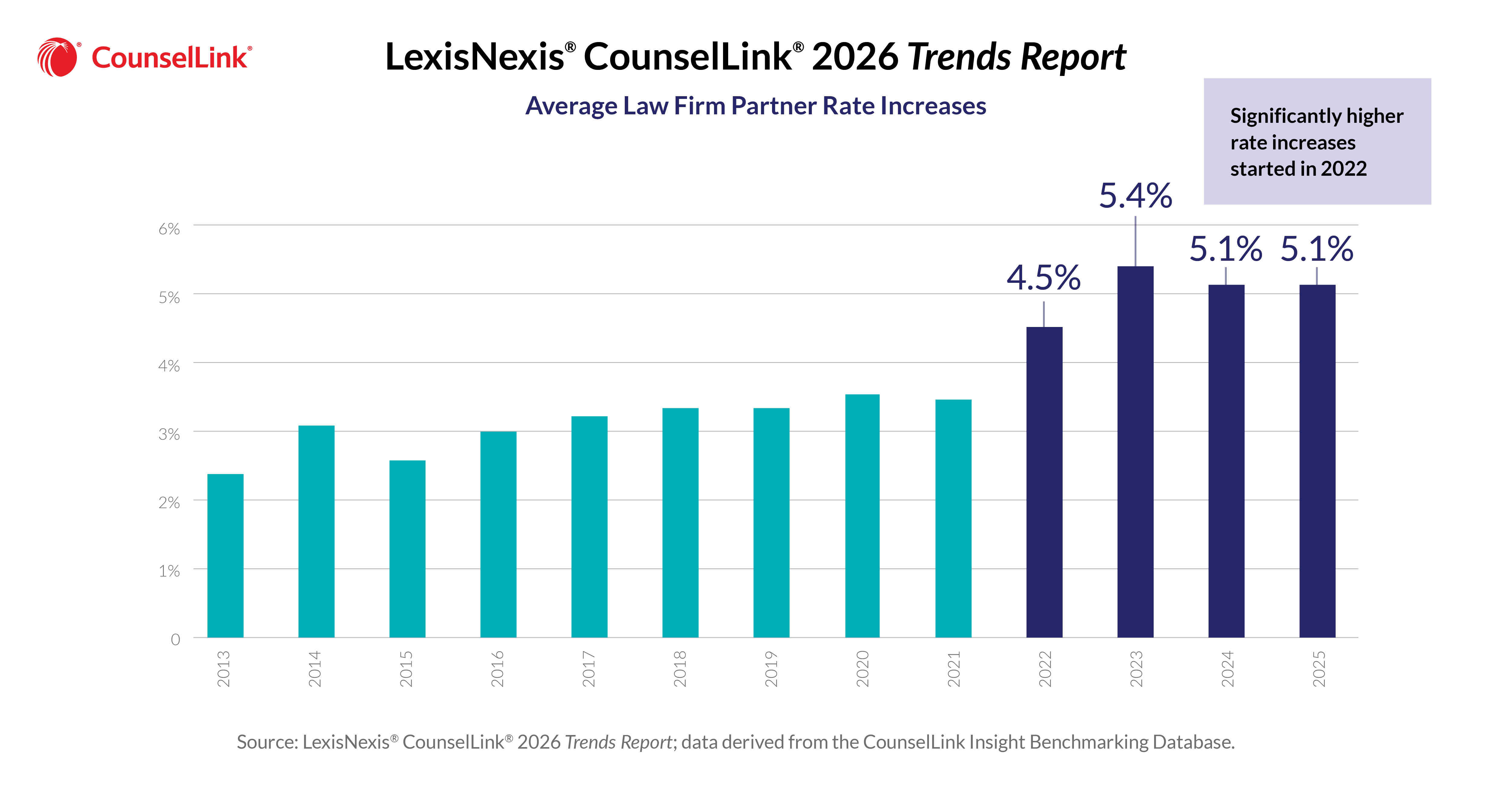 The CounselLink Trends Report draws on the CounselLink Insight Benchmarking Database of more than $75 billion in legal spend across more than 580,000 timekeepers and nearly 2 million matters. The report analyzes eight key metrics, including law firm partner fees by firm size, hourly rates by practice area, firm size and location, and international rate comparisons. Importantly, the report is based on actual invoices paid in 2025 to outside counsel by corporate legal departments over a 12-month period.