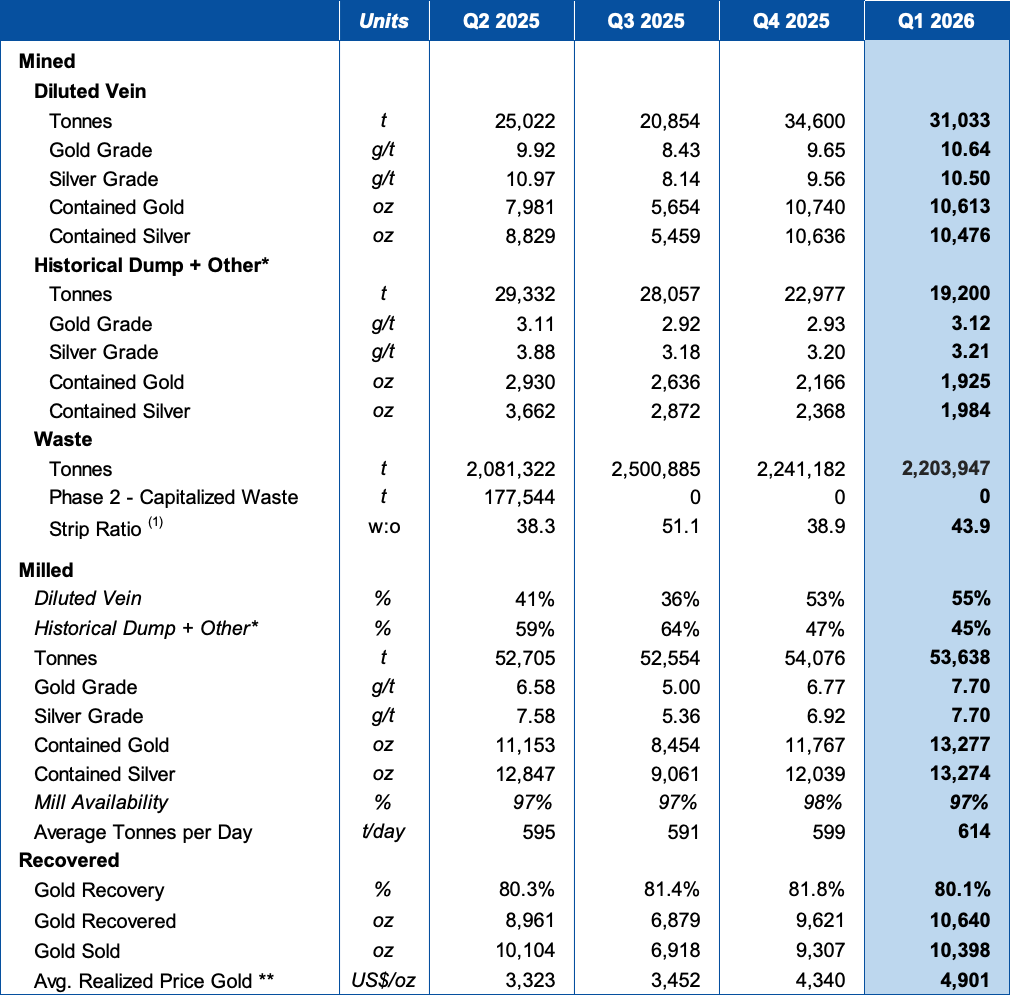 31,033 tonnes mined from diluted vein material containing 10,613 oz Au at 10.64 g/t Au and 10,476 oz Ag at 10.50 g/t Ag