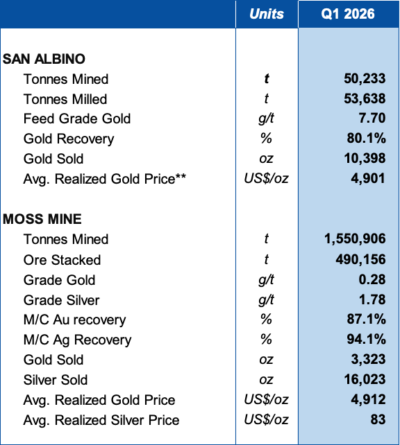 Table 1 – Detailed Operating Results for San Albino (Q2 2025 – Q1 2026)