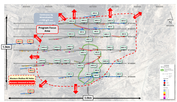 Silver mineralization is present across the deposit, with elevated silver grades present in both oxide and sulphide copper-mineralized zones and broadly correlated with copper grade. The Company is releasing these silver assays alongside a consolidation of all Pampa Medina drilling results to date, highlighting the significance of the consistent, high-grade copper and silver mineralization across a 3km by 2km area of interest.