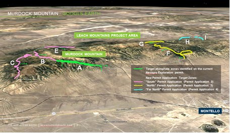 Based on the initial ETMI parameters (3-15% P₂O₅, 3.5 m average thickness, SG 2.6), the 3 new Applications to Prospect increase the conceptual exploration potential to more than 200 million tonnes of phosphate-bearing material. The combined Nevagro Permit and new applications can be grouped into four areas: