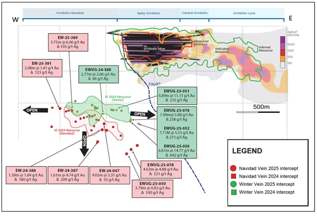 Drilling at the currently producing Ermitaño mine has delineated one primary, one secondary and several sub-parallel tertiary veins. The Ermitaño vein is delineated over 1,800 metres along strike and 550 metres down dip. The eastern extension of the vein is called the Luna or Ermitaño East Complex (Figure 2). The Ermitaño mine commenced production in Q4-2021. By the end of 2025 the Ermitaño mine had produced approximately 414,000 ounces of gold and 7.1 million ounces of silver.2