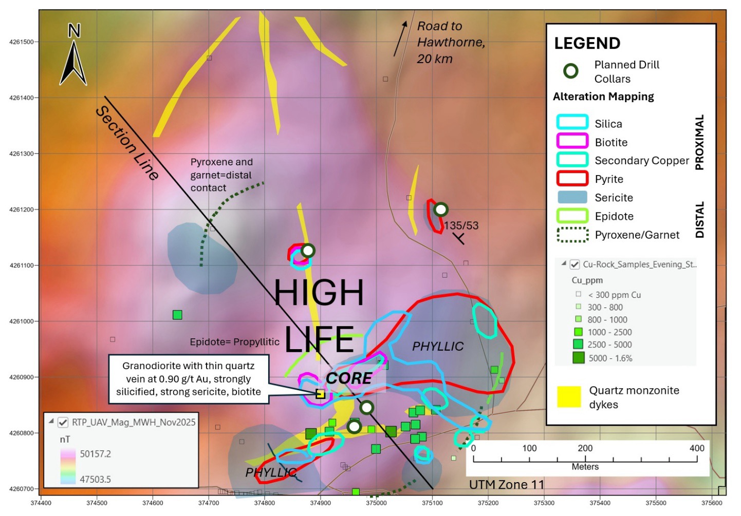 Recent fieldwork at the High Life target has identified strong alteration and gold mineralization consistent with a copper-gold porphyry system (see News Release dated March 31st, 2026), including silicification, sericite alteration, quartz veining, and localized copper mineralization. See Figure 1. These features are spatially associated with geophysical anomalies, including strong magnetic highs with coincident resistivity highs, supporting the interpretation of a robust porphyry system at depth.
