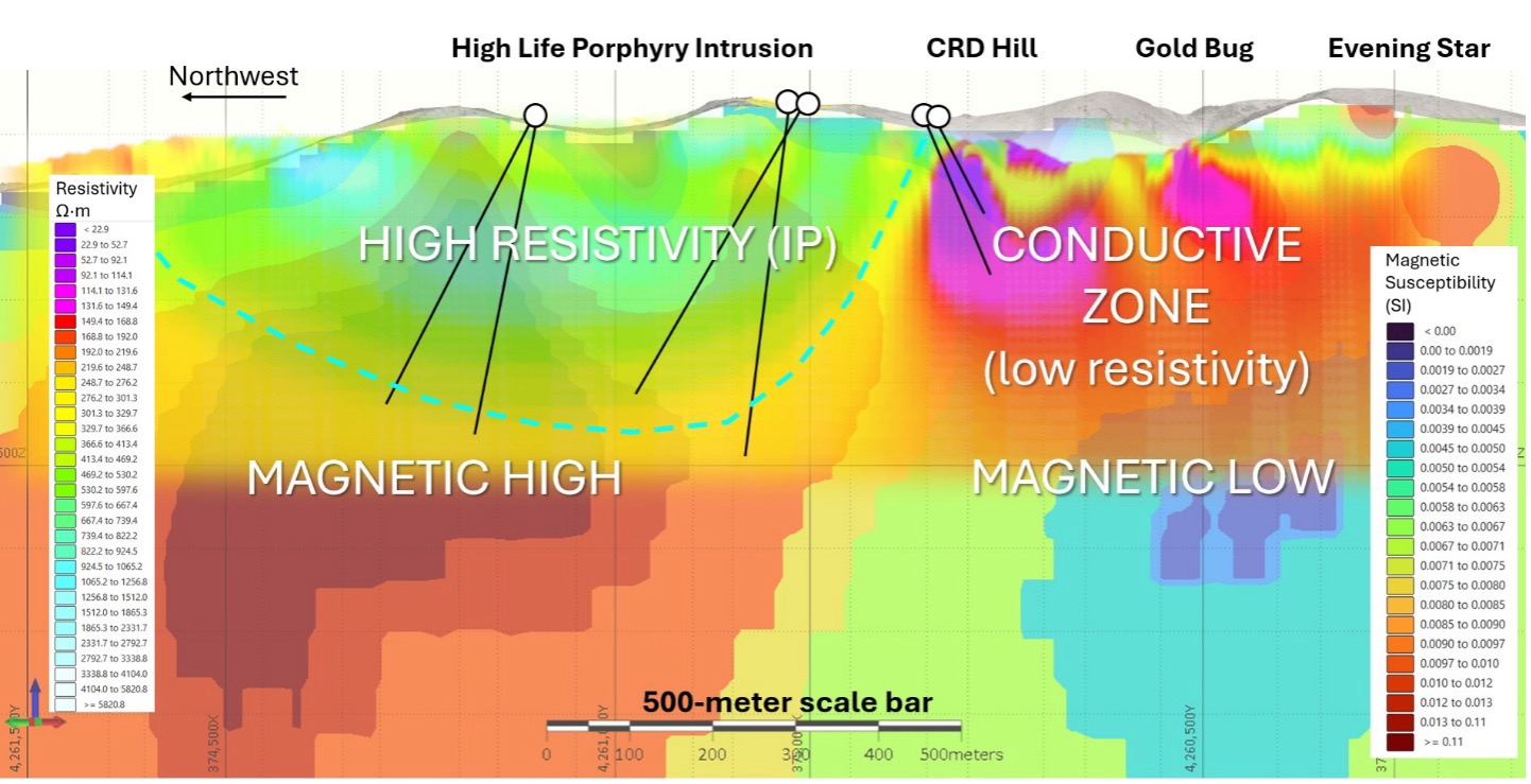 Figure 2. Section through High Life and CRD Hill with view to East. High Life porphyry is strongly resistive with a coincident 1-kilometer-wide magnetic high anomaly. CRD Hill is very conductive with a coincident large magnetic low.
